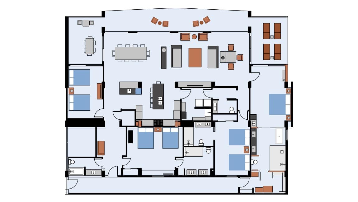 This penthouse includes a washer and dryer and has a massive oceanfront balcony stretching the length of the unit, where you can enjoy outdoor living. Four and a half richly designed bathrooms, as well as state-of-the-art lighting and design, complete this modern penthouse.